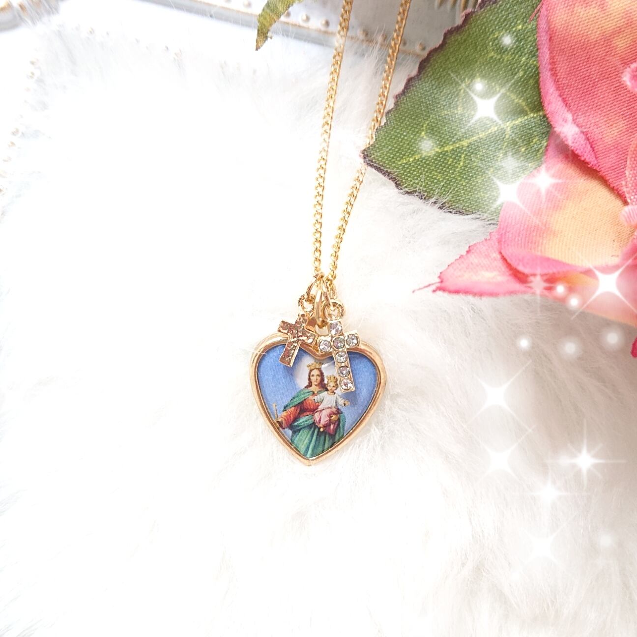 小さな幸せや運を引き寄せるクロスのネックレスです♡ハートのマリア様にプチクロスが付いたキュートなデザインのネックレスです。