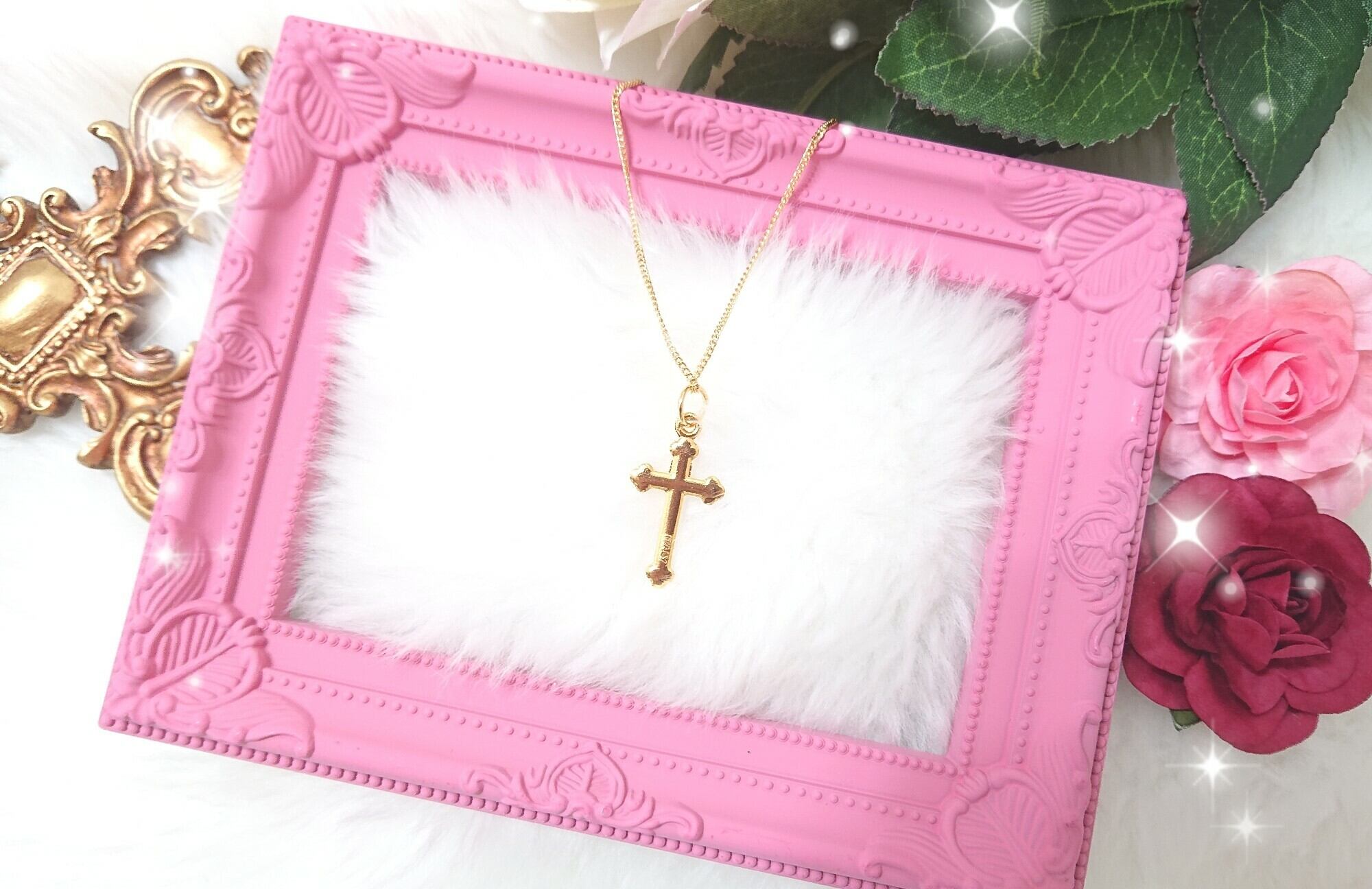 小さな幸せや運を引き寄せるネックレスです♡ピンクのクロスのキュートなネックレス。
